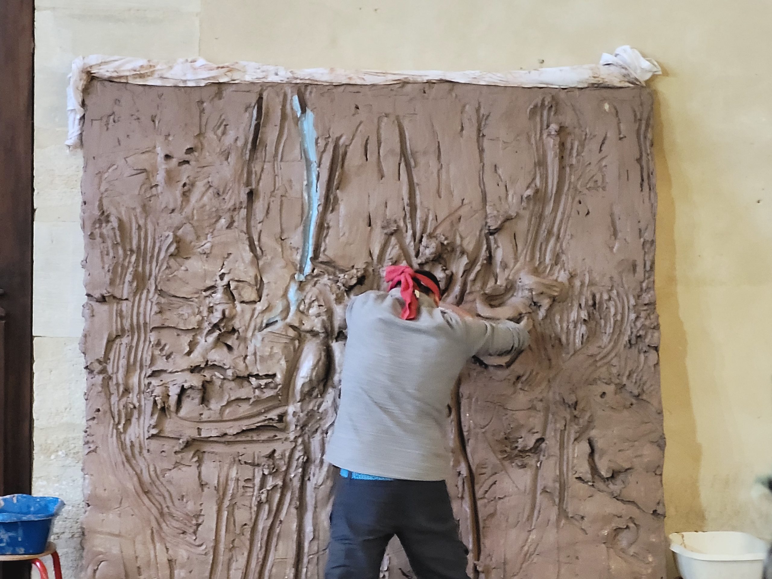 Accompagné par Ambre Blot et Camille La Ganza, les yeux bandés, je me suis laissé inspiré par leur musique et leur chant. J’ai modelé l’argile en direct sur un grand chevalet