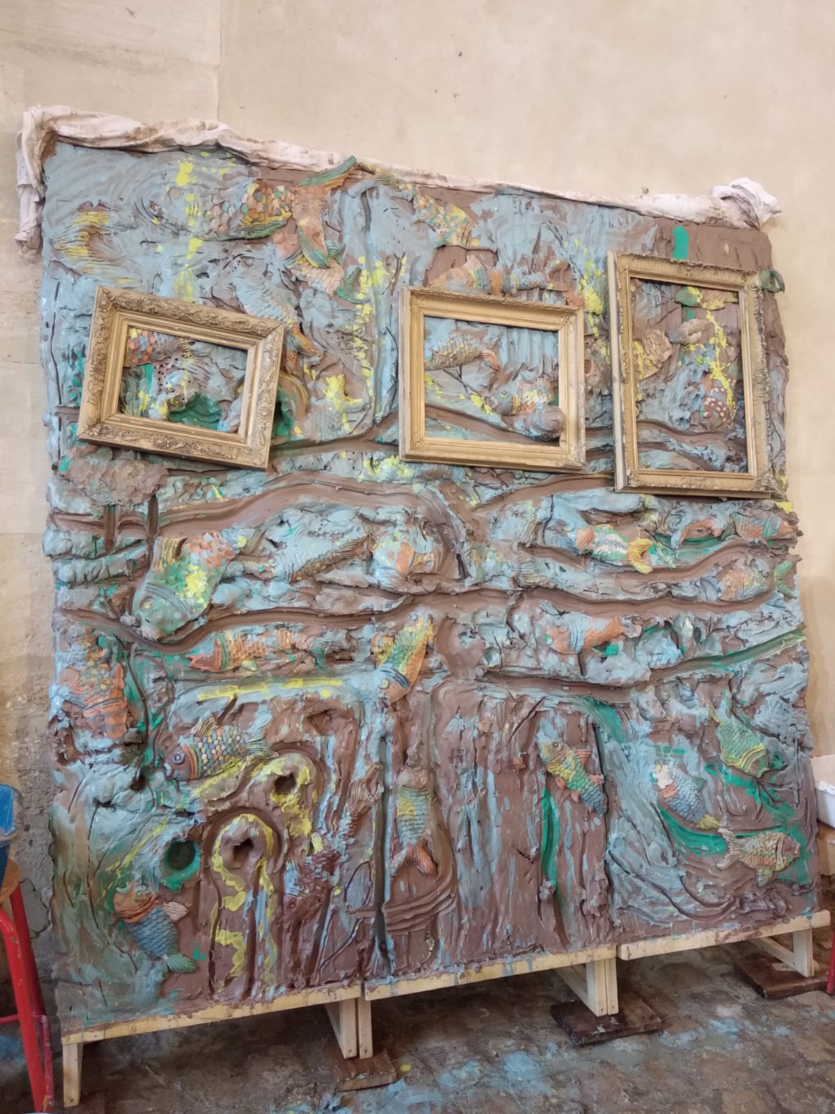 Une fantaisiste est venue subtilement interférer dans ma création, jusqu’à ce que le public, invité par elle, vienne aussi ajouter qui des poissons, qui des couleurs sur cette oeuvre éphémère et collective. Un grand moment solennel et festif !